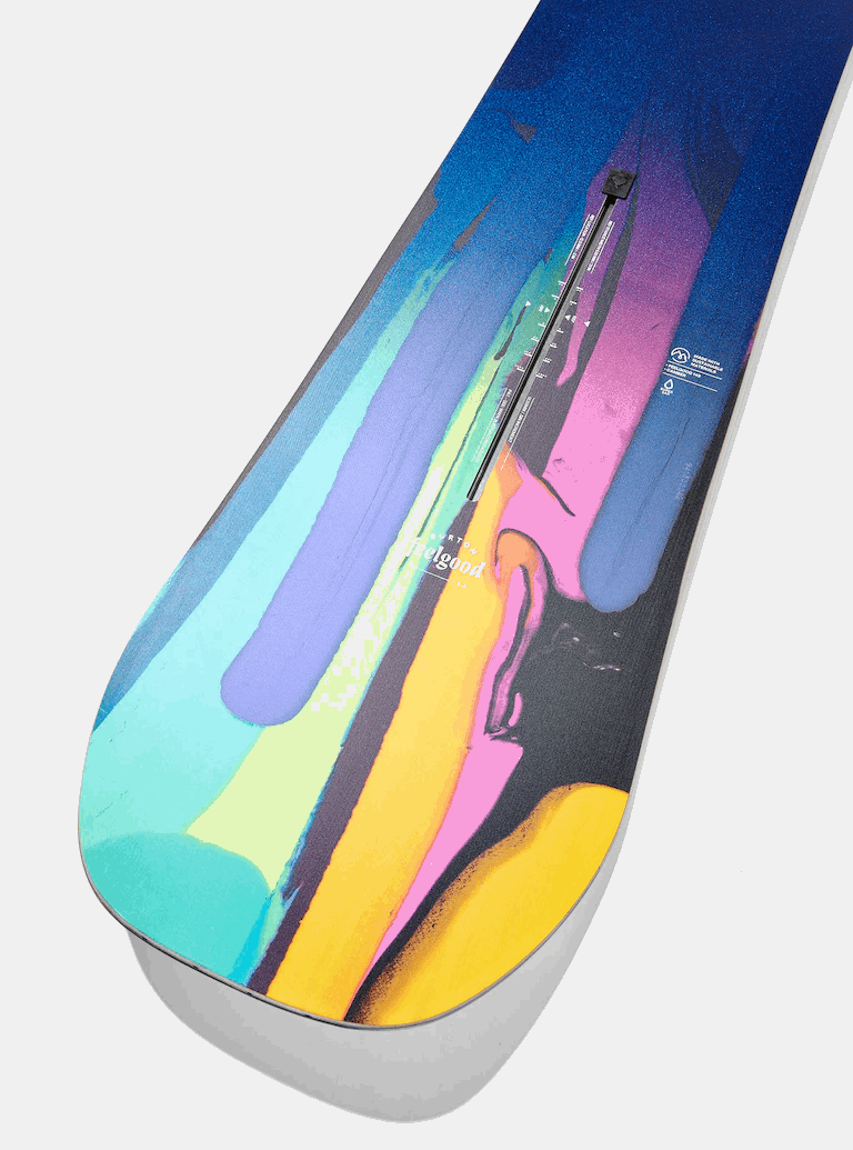 ABOUT THE GRAPHIC: Like a technicolor dream, the Feelgood is the magic carpet to make your dreams come true. Every drip and color in the graphic represents terrain you can ride. Just like the board's spirited ride and all-mountain versatility make every day on snow memorable.